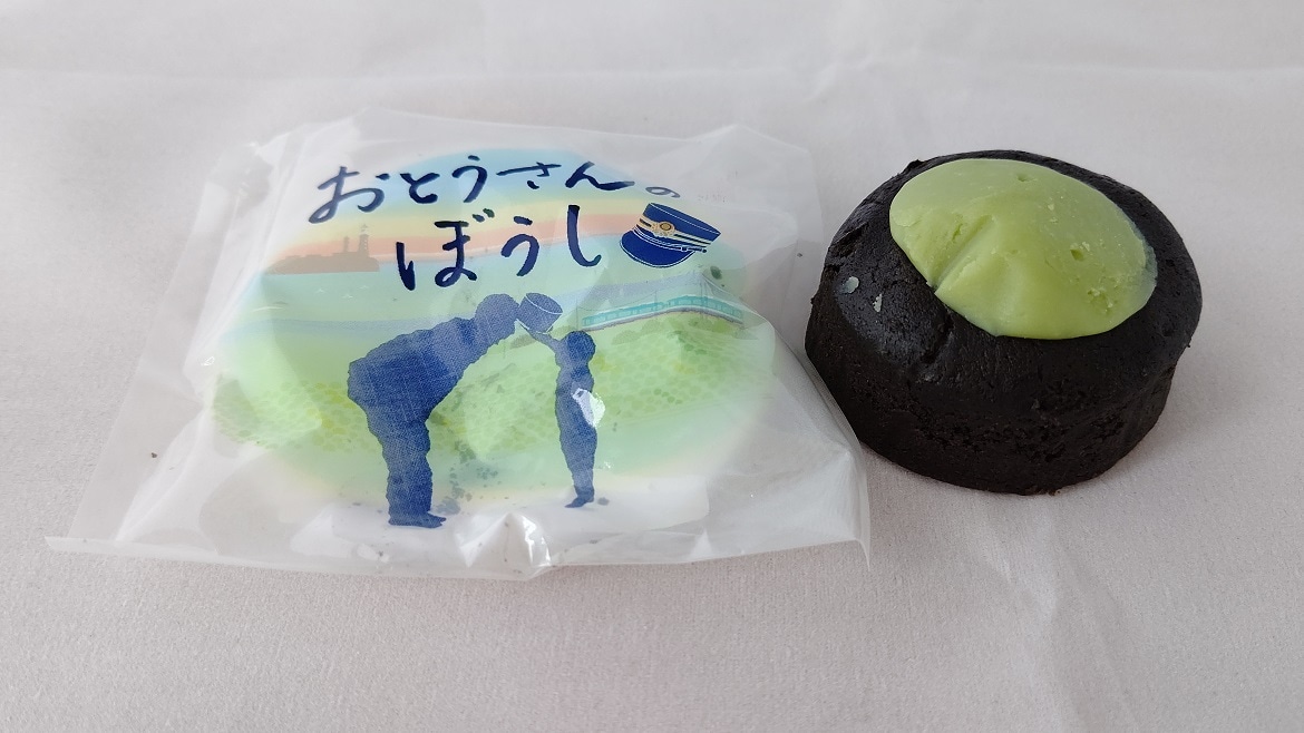 【商品名】おとうさんのぼうし チョコレートの風味とあんこの程よい甘さが溶け合った和風ケーキです。 トッピングのガナッシュには、銚子名産のメロンを贅沢に使用。 味と香りのハーモニーを是非お楽しみください。
